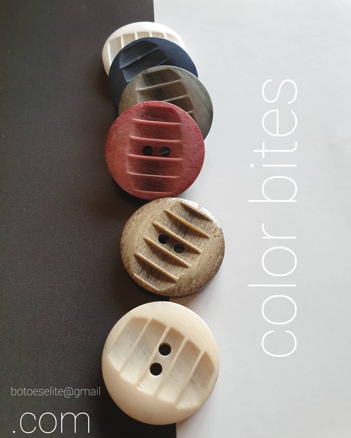 Corozo (Noz de Tagua): Utilizado em fatos, casacos e peças artesanais. Altamente sustentável e com um grão natural único, perfeito para adicionar textura subtil.